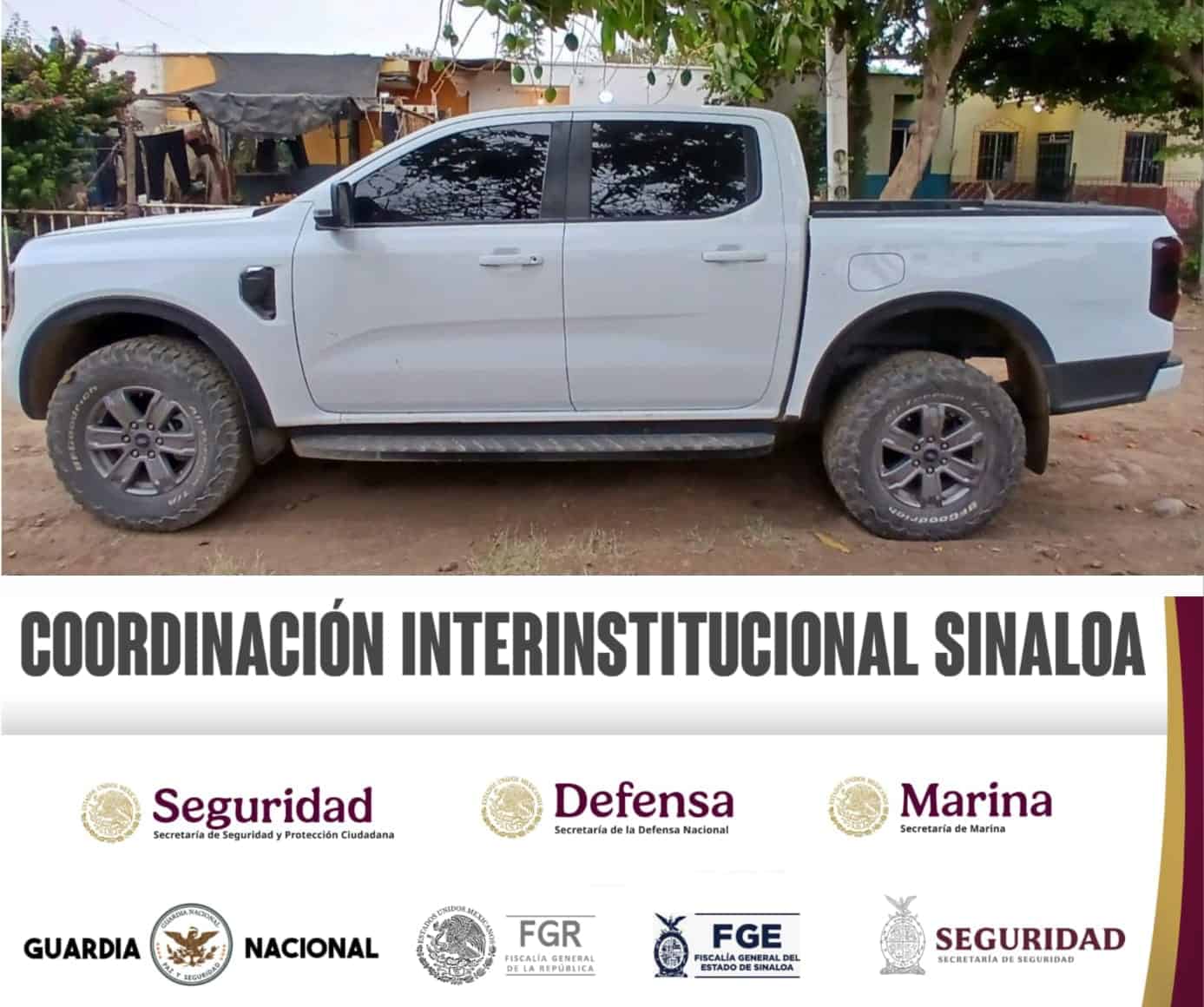 Durante recorridos terrestres en la sindicatura de El Diez, personal militar localizó una camioneta de la marca Ford, modelo Super Cab, la cual cuenta con reporte de robo vigente.