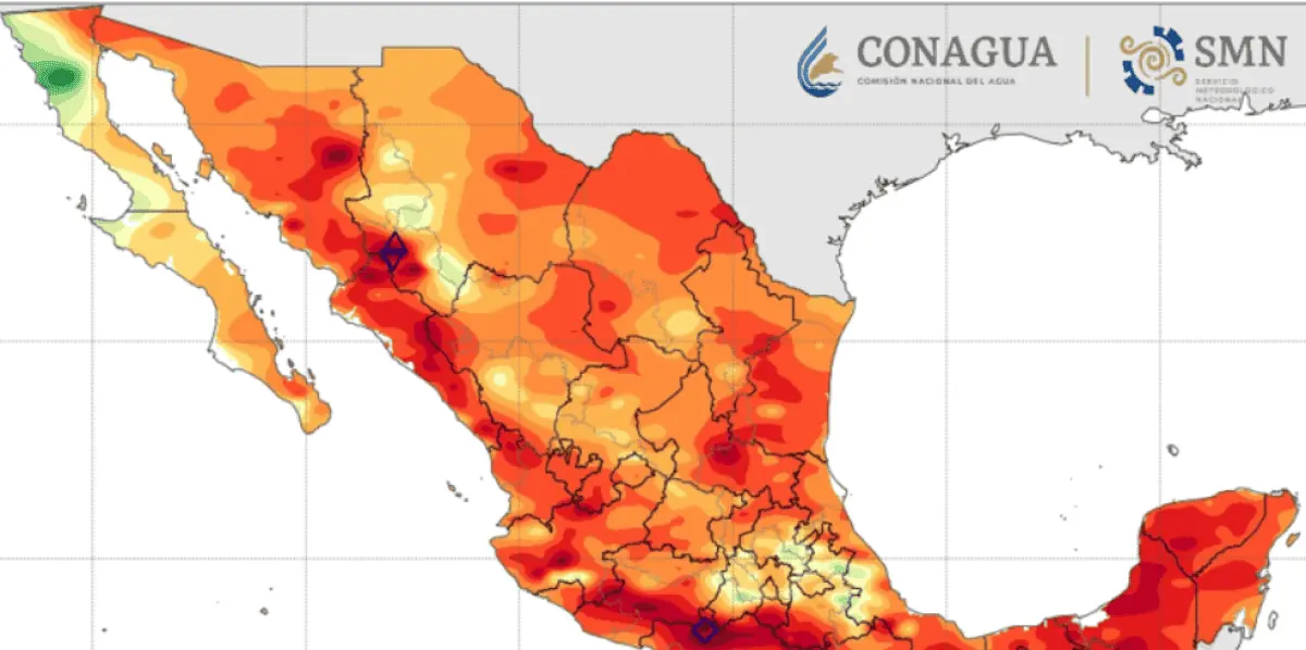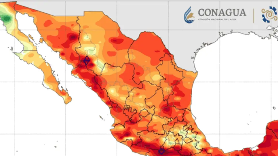 - Temperaturas máximas 35 a 40 °C: Sonora, Sinaloa, Nayarit, Colima, Chihuahua, Coahuila, Nuevo León, Tamaulipas, San Luis Potosí, Zacatecas, Durango, Guanajuato, Querétaro, Hidalgo, Estado de México (suroeste), Puebla, Veracruz, Tabasco, Chiapas, Campeche y Yucatán.