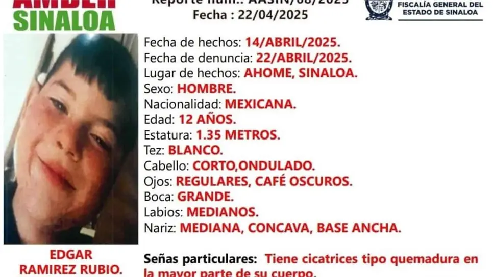 Edgar Ramírez Rubio, el menor de 12 años que había sido reportado como desaparecido desde el pasado 14 de abril, fue localizado sano y salvo, según informó la Fiscalía General del Estado de Sinaloa.