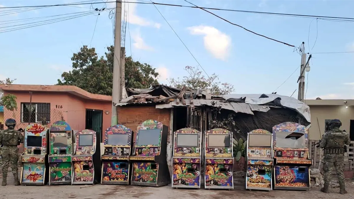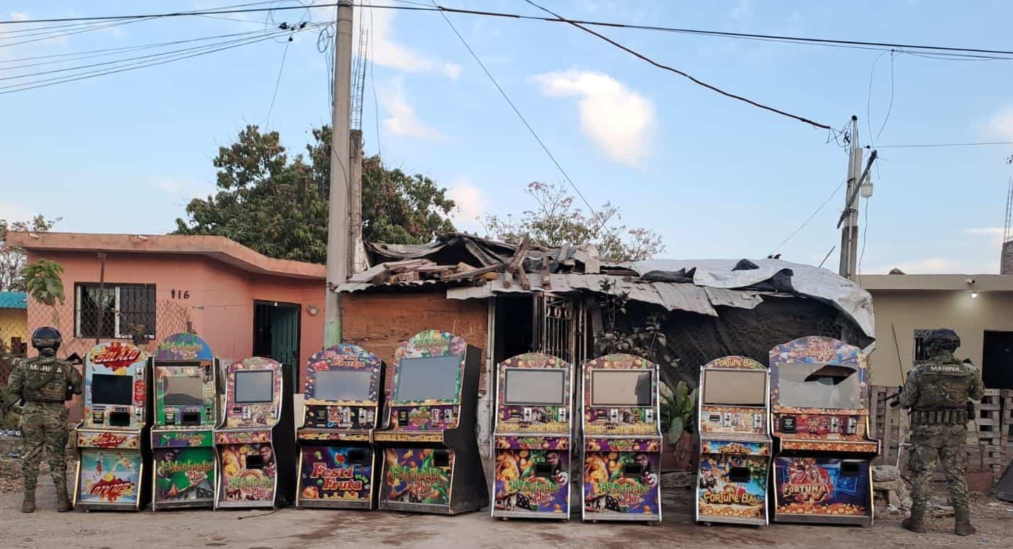 Finalmente, en el poblado Agua Verde, municipio de El Rosario, personal naval visualizó y aseguró 12 máquinas tragamonedas que operaban de forma ilegal afuera de un inmueble.
