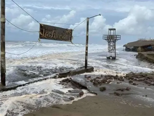 Una marejada anticipada sorprendió la mañana de este lunes 28 de abril a trabajadores y visitantes de la playa Las Glorias, donde el agua alcanzó restaurantes, viviendas e incluso el bulevar principal.