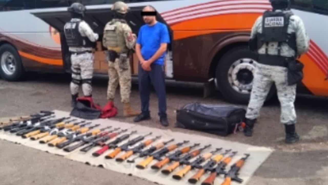 Elementos del grupo interinstitucional detuvieron a un sujeto con pistolas y rifles de asalto que llevaba ocultos en maletas en un transporte de pasajeros en la caseta de cobro en la sindicatura de Costa Rica al sur de Culiacán.