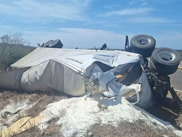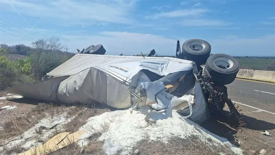 Un tráiler cargado de azúcar terminó volcado luego de un fuerte choque contra otro tráiler cuando ambos circulaban por la autopista Mazatlán-Culiacán a la altura de la comunidad de Tayoltita, perteneciente a Elota.