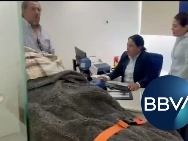 En un video difundido en redes, se puede ver a Fidelia acostada en una camilla dentro de la sucursal, mientras dos empleados de BBVA la atienden.