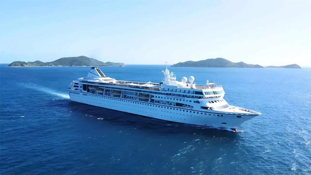 Con 24 mil 344 toneladas, 195 metros de eslora y 22.5 metros de ancho, el Villa Vie Odyssey es un hogar flotante completamente funcional que cuenta con centro de negocios con internet de alta velocidad, spa, centro de bienestar, bar de piscina, pub de día, salones de lectura y hasta atención médica a bordo.