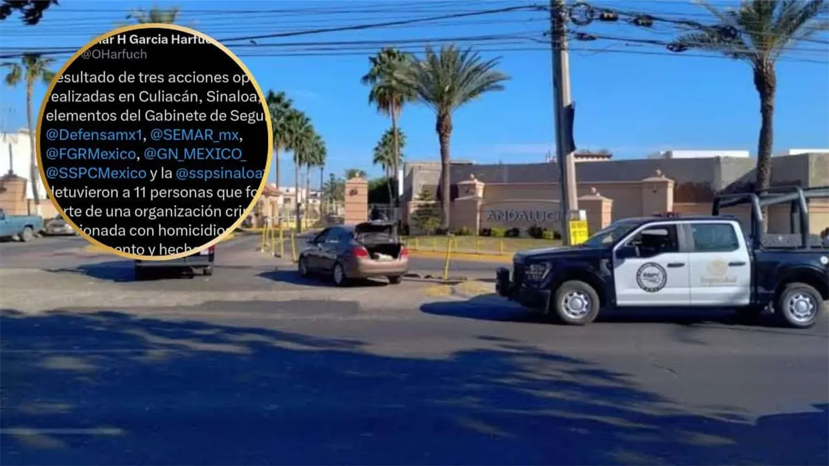 El secretario de Seguridad y Protección Ciudadana, Omar García Harfuch, informó la detención de 11 personas en Culiacán, las cuales forman parte de una organización criminal dedicada a homicidios, resguardo de armamento y hechos violentos.