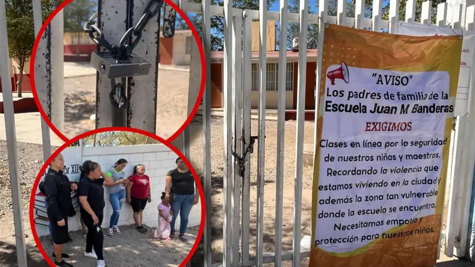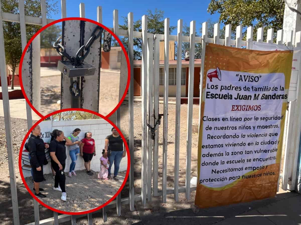 Tras balaceras en la Colonia Renato Vega Amador, en Culiacán, padres de familia toman la primaria Juan M. Banderas exigiendo clases en línea, con esto, padres y madres colocaron un candado en la institución para impedir el paso a toda persona.
