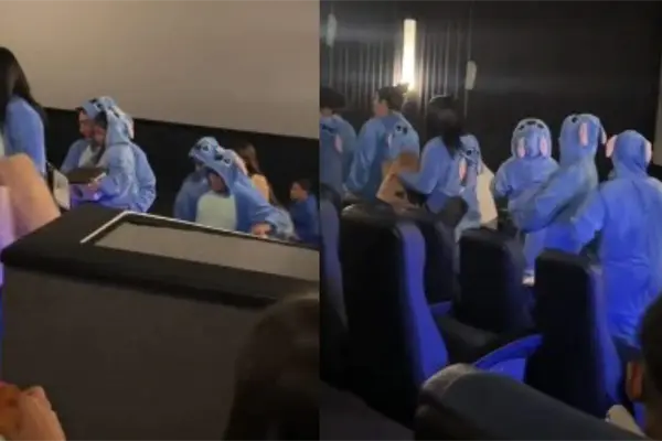 En una sala de cine una familia fue la verdadera sensación al ingresar al lugar vestidos con pijamas de Stich, donde las personas que estaban en el lugar captaron el divertido momento.