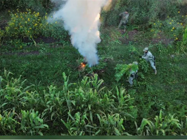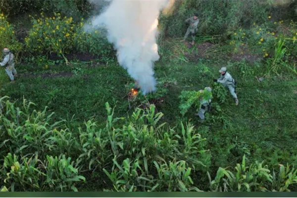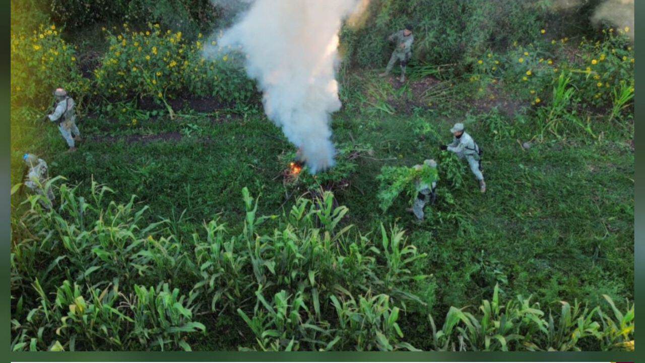 Al continuar con los recorridos terrestres en el poblado antes mencionado y en el marco del operativo "Búsqueda, Localización y Destrucción de Laboratorios Clandestinos", los elementos militares ubicaron un sembradío de aparente marihuana, con una dimensión aproximada de 500 metros cuadrados, por lo que procedieron a la destrucción de las plantas, que tenían una altura de alrededor de 1 metro.