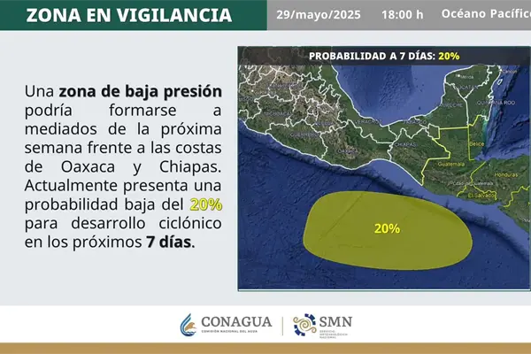 Según los reportes oficiales, esta zona presenta actualmente un 20 por ciento de probabilidad de desarro ciclónico en los próximos siete días y se espera que su evolución se concentre a mediados de la próxima semana, frente a las costas de Oaxaca y Chiapas.
