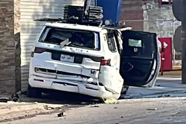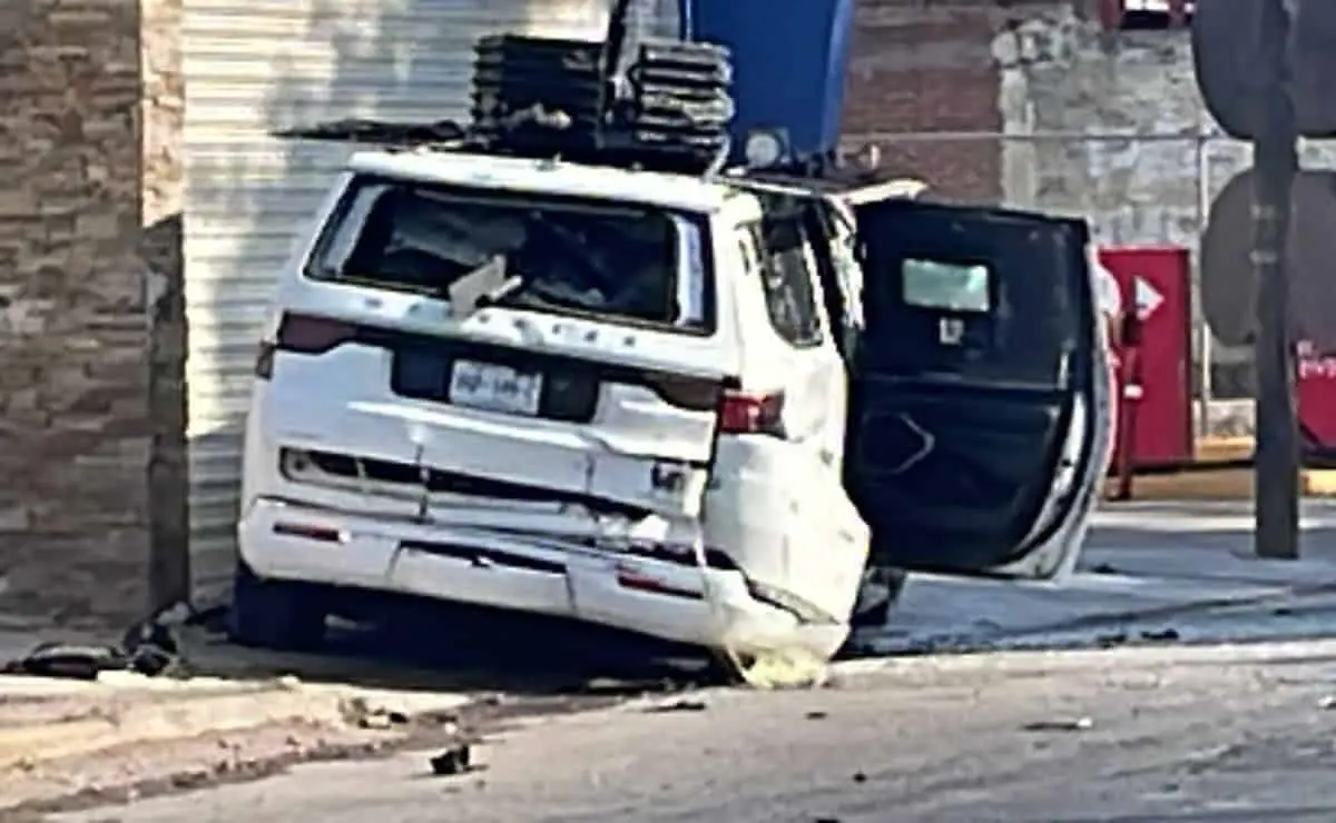 La Jeep Cherokee quedó totalmente destrozada de su carrocería y cristales, sobre la avenida Álvaro Obregón, esquina con la calle Sociólogos, como huella de la batalla qué se registró en la colonia Tierra Blanca, la madrugada de este domingo.