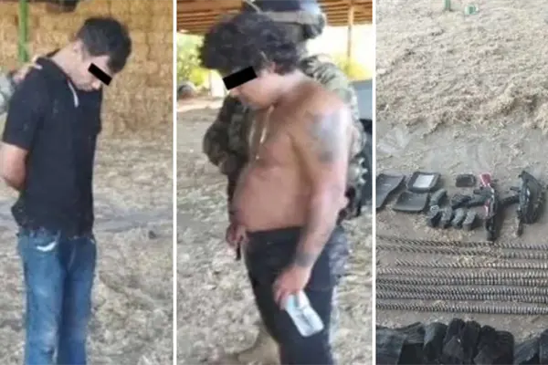 Uno de los detenidos vestía playera negra tipo polo y pantalón de mezclilla azul, mientras que el otro vestía pantalón de mezclilla negro y se encontraba sin camisa, con visibles tatuajes en su brazo izquierdo.