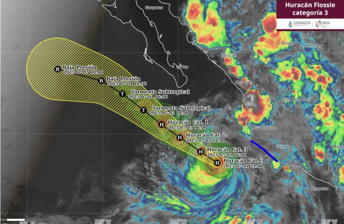 La noche de este martes, el huracán Flossie se ha intensificado a categoría 3, en la escala Saffir-Simpson, de acuerdo al Servicio Meteorológico Nacional (SMN) de la Comisión Nacional del Agua.