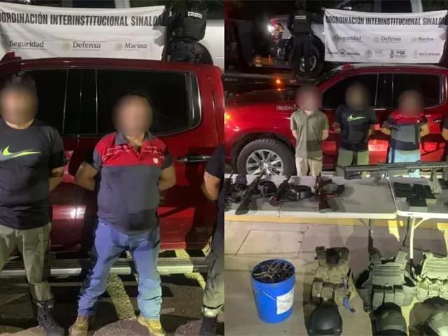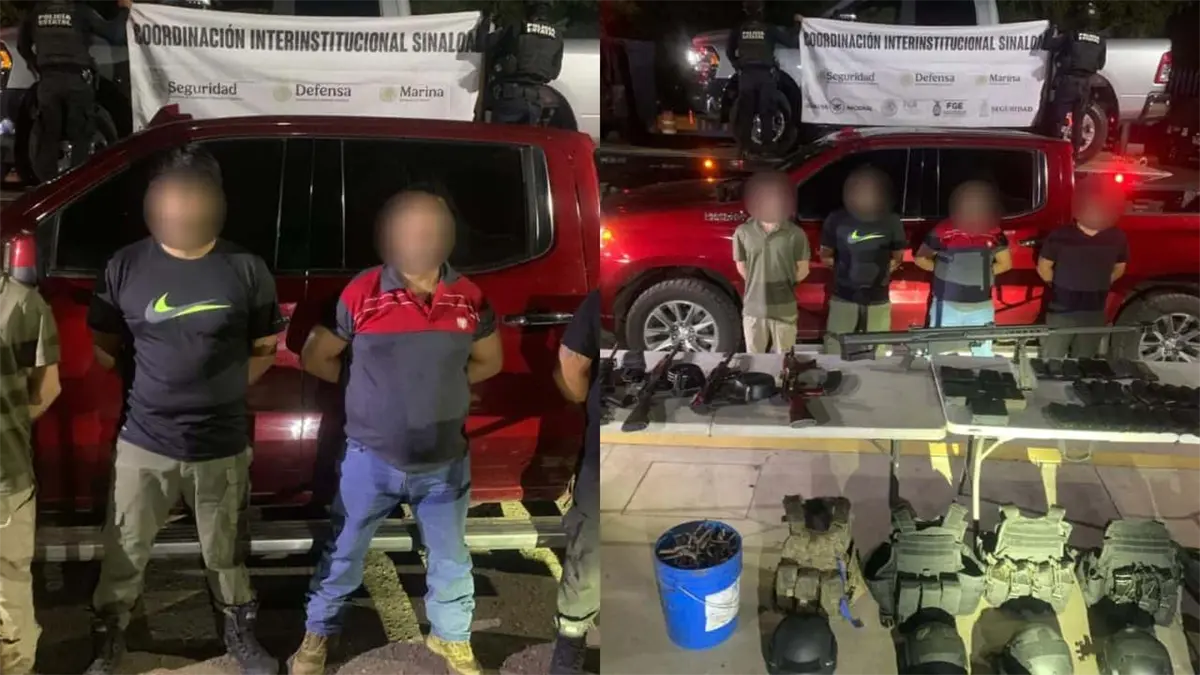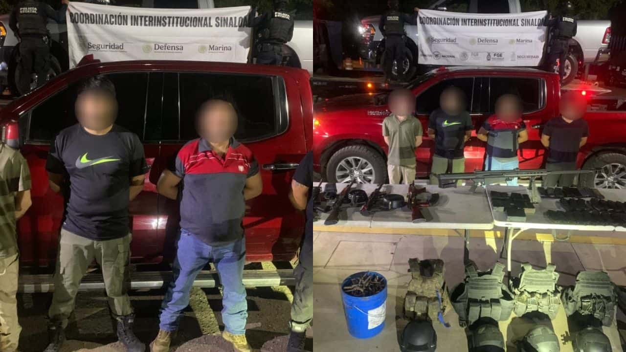 Elementos del Ejército Mexicano, en coordinación con la Guardia Nacional, la Secretaría de Marina, la Secretaría de Seguridad y Protección Ciudadana, la Fiscalía General de la República, la Fiscalía General del Estado y la Secretaría de Seguridad Pública, a través de la Policía Estatal Preventiva, aseguraron en Culiacán a cuatro civiles, así como armas, cargadores, equipo táctico y dos camionetas.