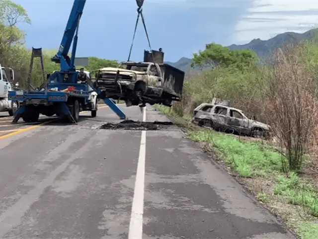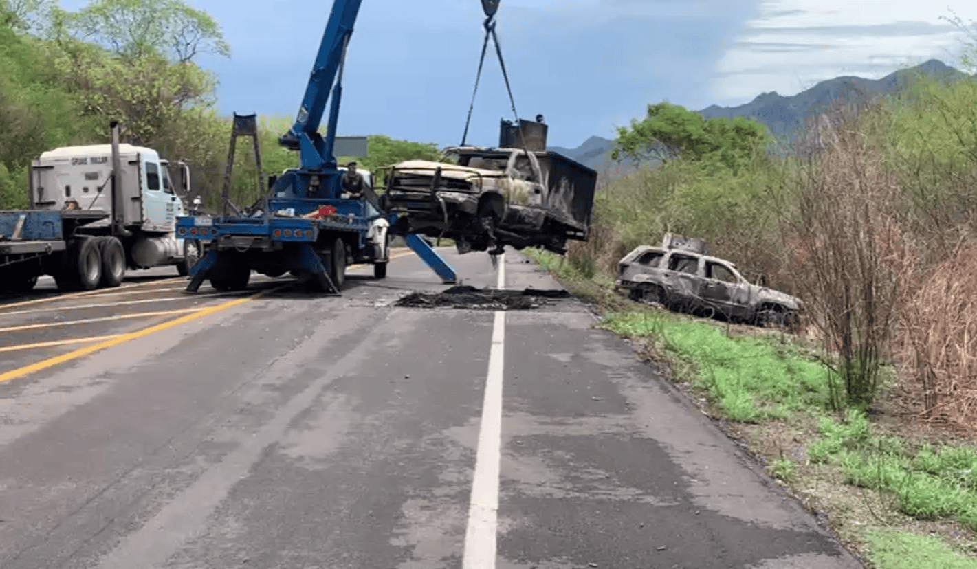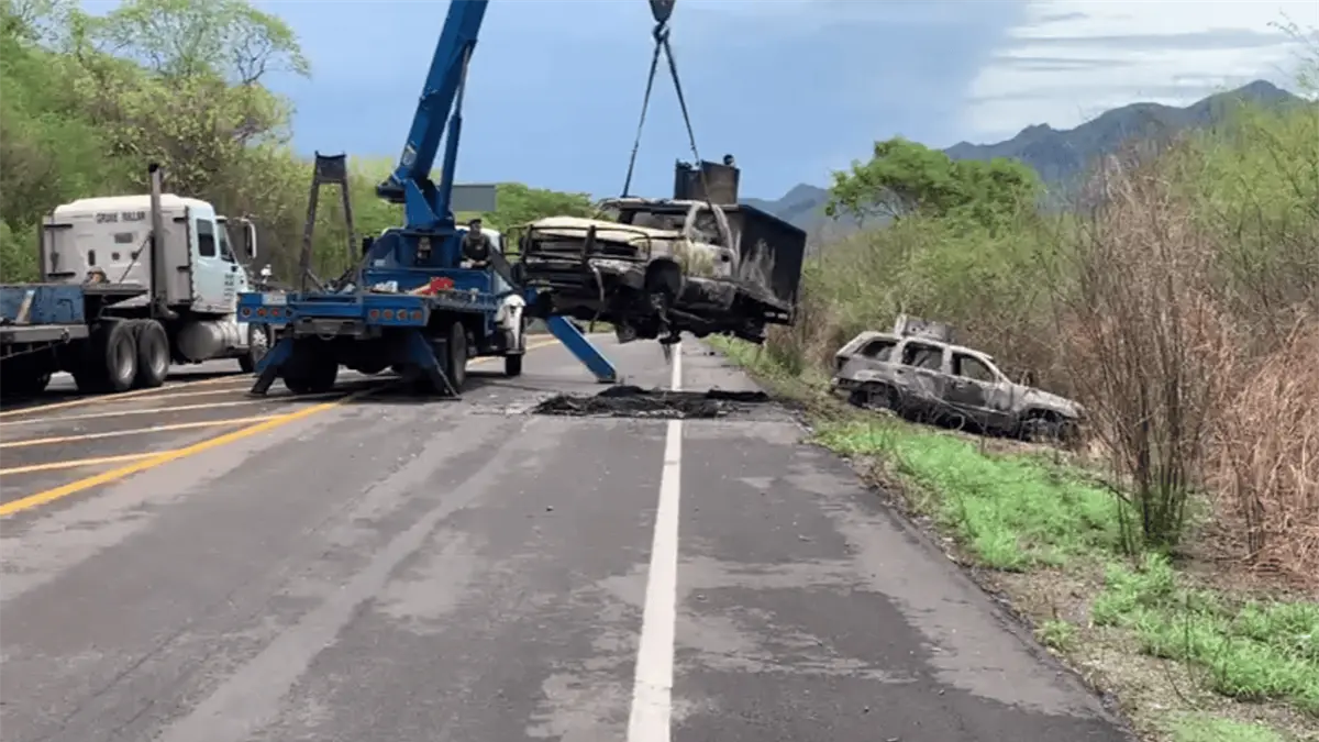 Para poder retirar las camionetas calcinadas fue necesario utilizar unas grúas para llevar las unidades a una pensión de vehículos.