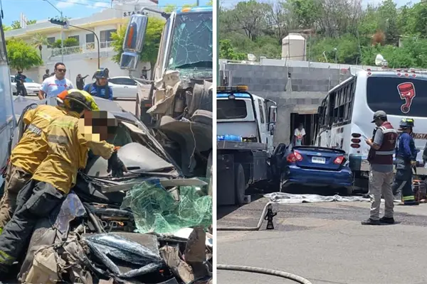 El accidente se registró durante esta mañana cuando la grúa de plataforma conducía de sur a norte por el bulevar Alberto Einstein y al pasar el bulevar de Ciudades Hermanas se impactó contra el Toyota Corolla y contra el camión urbano.