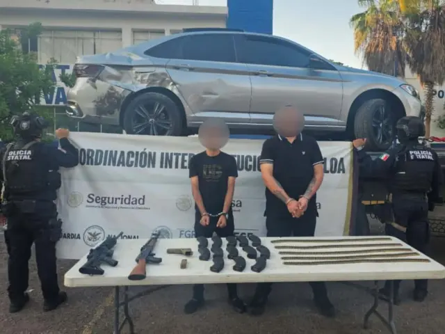 Elementos del grupo interinstitucional detuvieron a dos personas que portaban armas, cargadores y cartuchos, además de circular en un vehículo con reporte de robo en Culiacán.