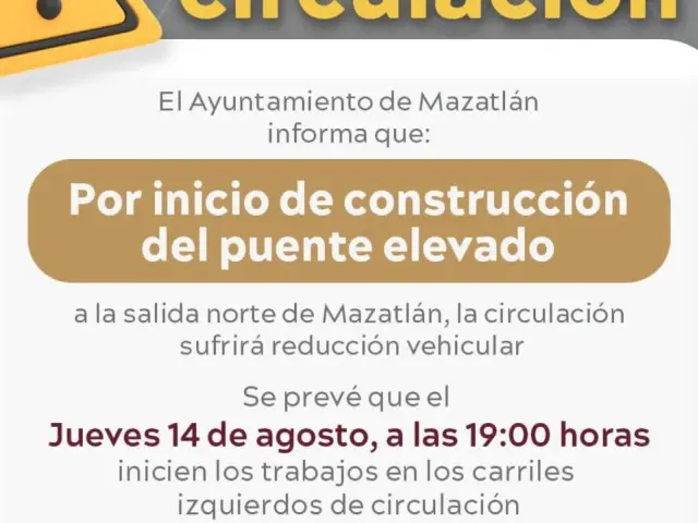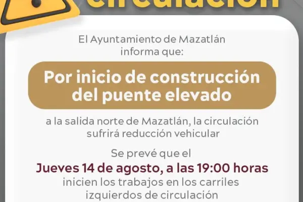 La Secretaría de Seguridad Pública, a través de la Dirección de Tránsito Municipal, dio a conocer que a partir de las 19:00 horas del jueves 14 de agosto se reducirá la circulación en ambos sentidos sobre la carretera México 15 a la salida norte de Mazatlán, frente a Plaza Acaya, debido al inicio de los trabajos de construcción del puente vehicular.