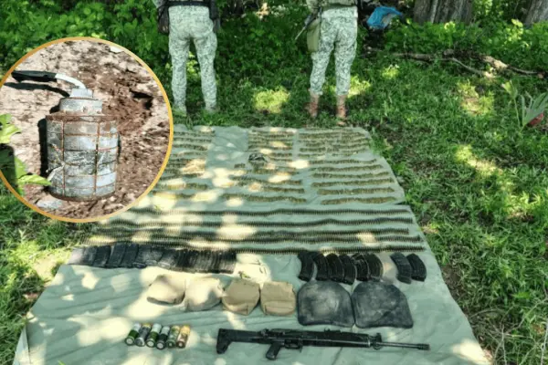 Entre lo localizado se encuentra un arma larga calibre 7.62 x 39 milímetros, 6 granadas calibre 40 milímetros, 22 cargadores, además de mil 750 cartuchos de diferentes calibres.