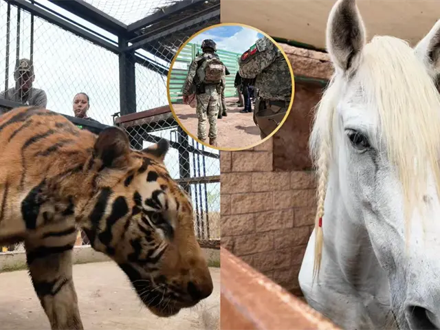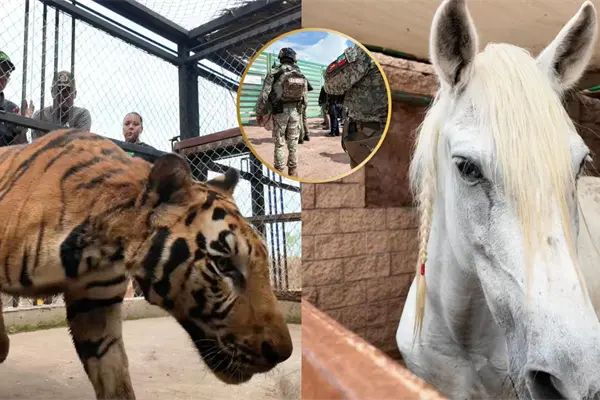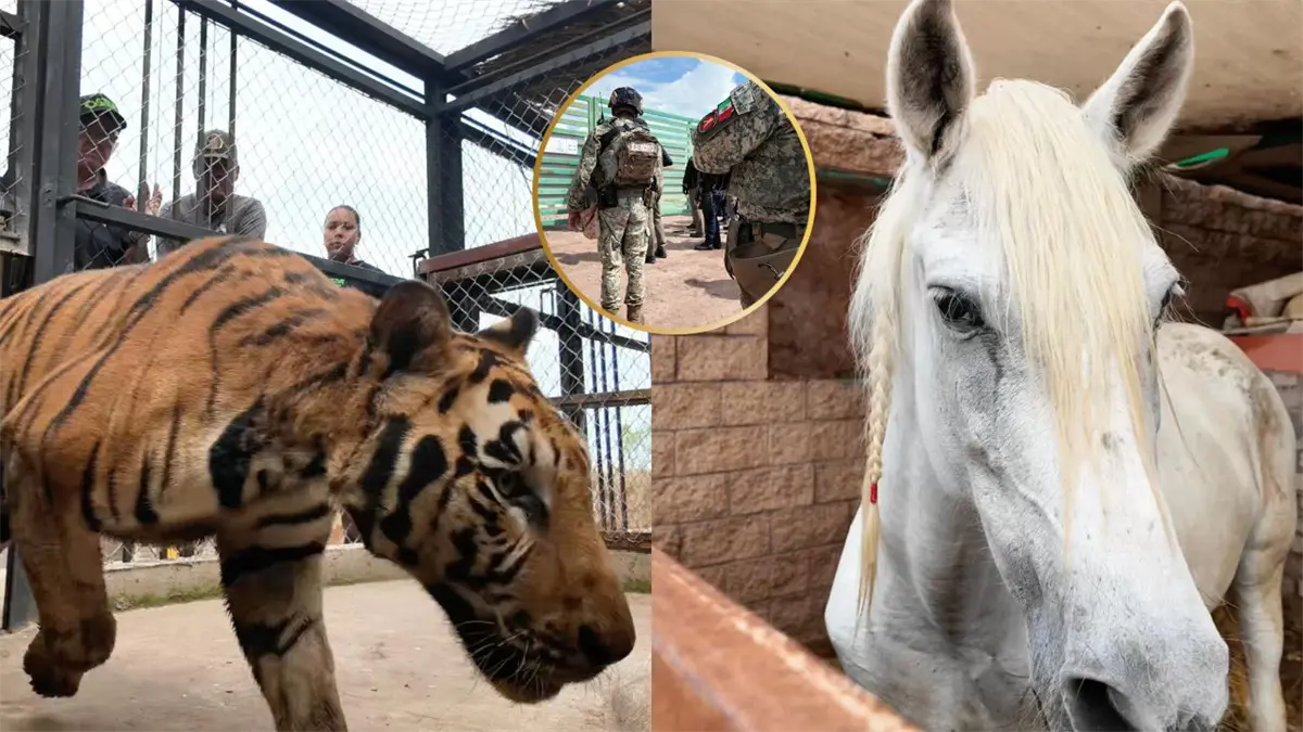 Los dos tigres de bengala de aproximadamente 2 años de edad se encontraban encerrados en una jaula de acero, mientras que el caballo y la yegua española descansaban en caballerizas con aire acondicionado cuando los agentes de seguridad ingresaron al inmueble.