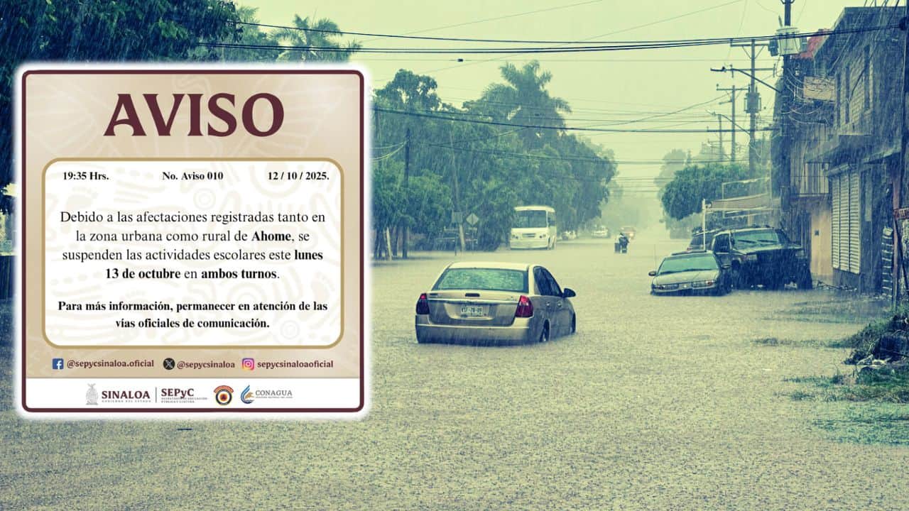 La SEPyC de Sinaloa anunció la suspensión de clases en todos los niveles educativos del municipio de Ahome para este lunes 13 de octubre de 2025, debido a las afectaciones generadas por las intensas lluvias derivadas de los remanentes del ciclón Raymond.