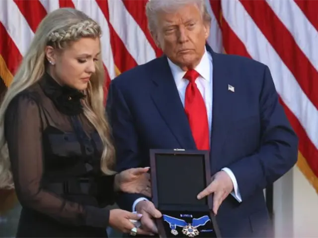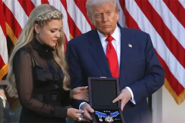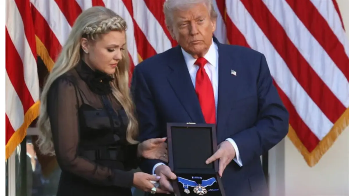 La medalla fue recibida por la viuda de Kirk, Erika Kirk, a quien Trump describió como "una mujer de inspiración, bella y hermosa" y le dijo que su esposo "se sacrificó por el país".