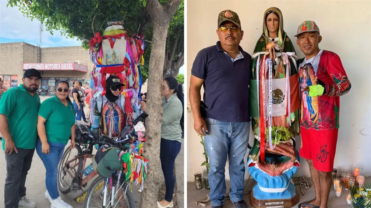 Santiago, el peregrino guadalupano que atraviesa Sinaloa en bicicleta con la Virgen de Guadalupe en hombros