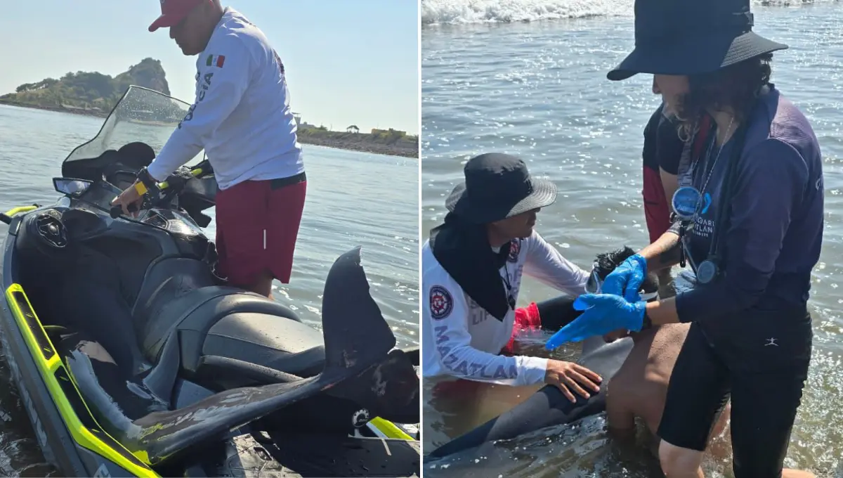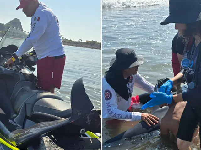Un delfín fue rescatado este jueves tras aparecer varado en la zona de playa de la Isla de la Piedra, en Mazatlán. Elementos del Escuadrón de Salvamento Acuático, adscritos a la Secretaría de Seguridad Pública Municipal, acudieron al llamado ciudadano y activaron el protocolo correspondiente para la atención de fauna marina.
