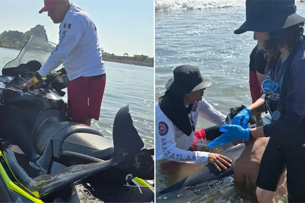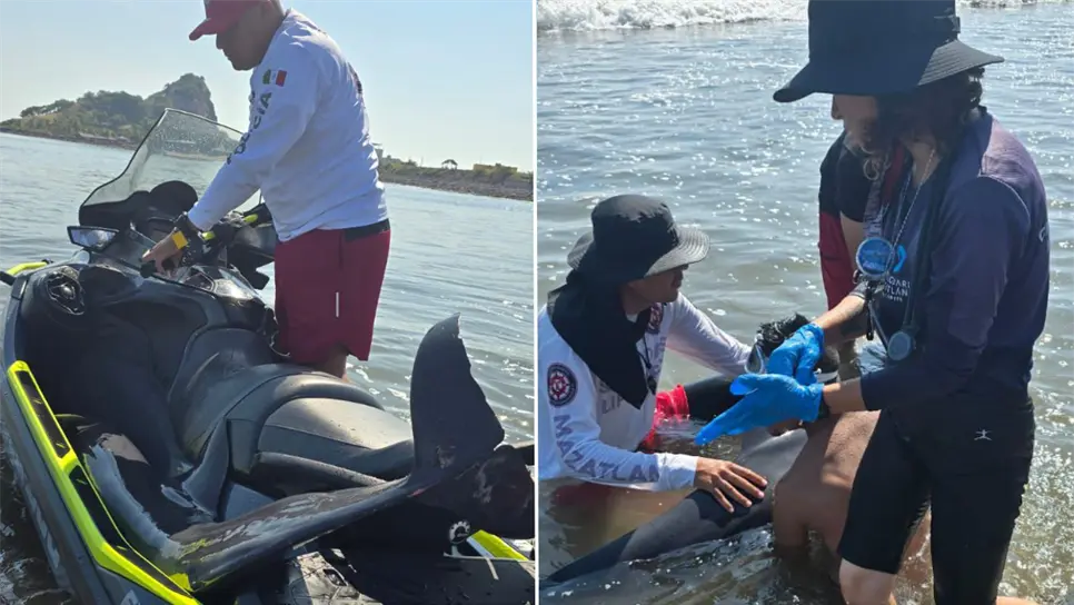 Con el apoyo de un jet ski, los rescatistas trasladaron al delfín mar adentro, donde fue liberado con éxito en su hábitat natural.