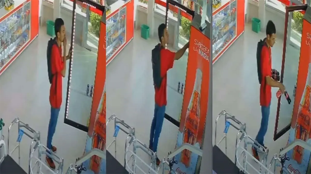 Mientras la trabajadora atendía a una clienta, el hombre se dirigió tranquilamente hacia el refrigerador de bebidas, lo abrió y permaneció unos segundos observando el interior. Luego tomó tres refrescos de cola y un suero, regresó uno de los envases para cambiarlo por otro sabor, y salió del local sin pagar, volteando únicamente a ver a la encargada como señal de que no pagaría.