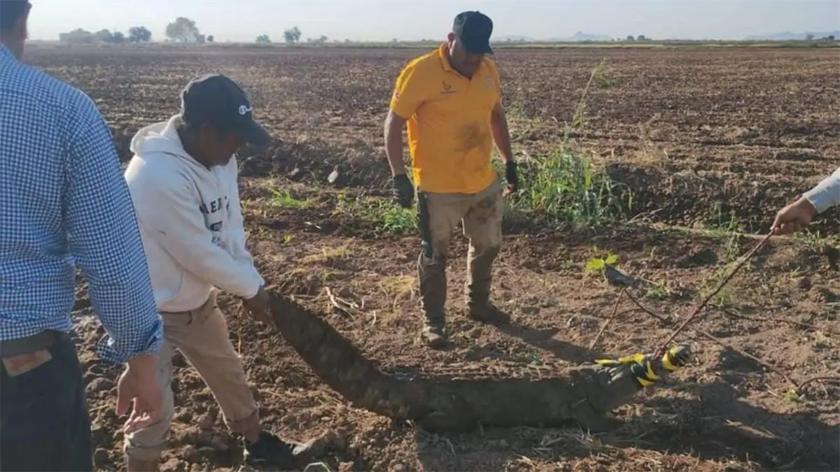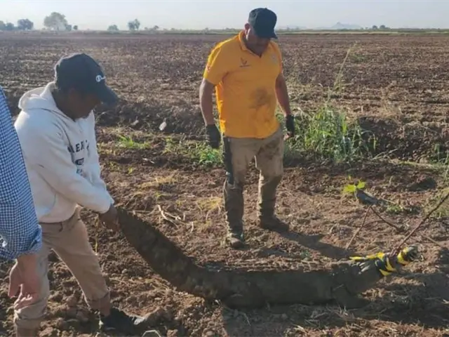 De acuerdo con la información proporcionada por los cuerpos de emergencia, el reptil fue localizado semisumergido en el canal de riego de tierras agrícolas por trabajadores del campo.