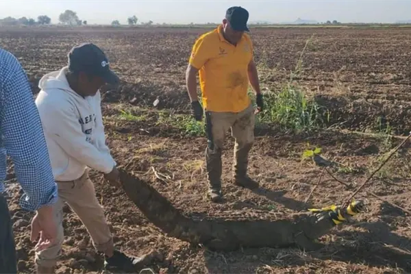 El reptil fue detectado por trabajadores del campo y capturado por Protección Civil; autoridades federales lo pusieron bajo resguardo.