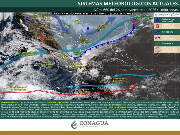 Durante esta noche y madrugada del jueves, el frente frío núm. 16 recorrerá el noreste y oriente del país, en interacción con un canal de baja presión extendido sobre el suroeste del Golfo de México y el sureste mexicano, ocasionarán lluvias puntuales intensas en Puebla, Veracruz y Oaxaca; lluvias muy fuertes en Nuevo León, Tamaulipas, San Luis Potosí, Hidalgo, Veracruz, Tabasco y Chiapas; lluvias puntuales fuertes en Querétaro, Puebla y Veracruz, además de chubascos en Coahuila, Zacatecas, Guanajuato, Estado de México, Ciudad de México, Tlaxcala, Campeche, Yucatán y Quintana Roo y lluvias aisladas en Morelos.