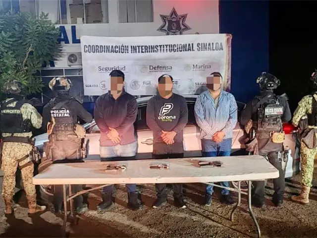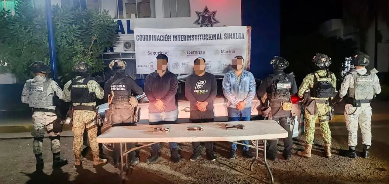 Elementos del Grupo de Operaciones Especiales (GOES) de la Policía Estatal detuvieron a tres presuntos sicarios que portaban pistolas y viajaban en un vehículo robado, en la colonia Buena Vista, en Culiacán.