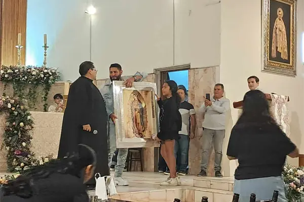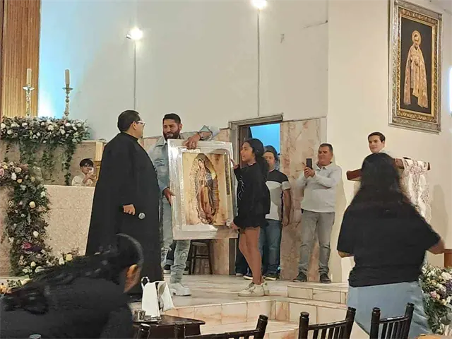 El cantante de "Mi enemigo el amor" recibió los aplausos de los católicos y de manos del párroco de Nuestra Señora de Guadalupe, Carlos Zazueta, le entregó un cuadro de la Virgen de Guadalupe.