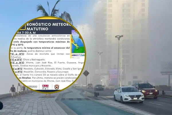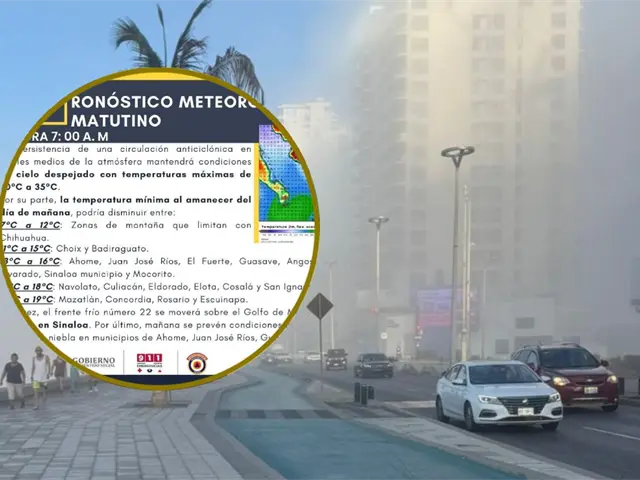 Protección Civil de Sinaloa pronostica temperaturas de 16 a 29 °C y posible presencia de bancos de niebla al amanecer de mañana sábado.