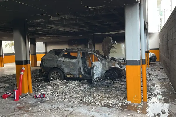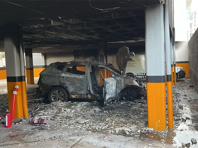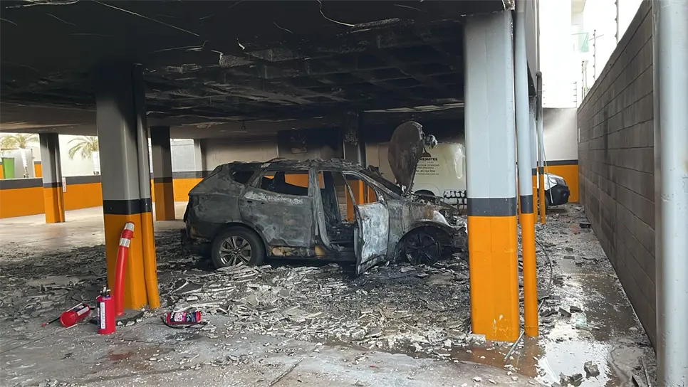 El conductor se dirigió hacia el fondo del estacionamiento donde estaba solo para evitar causar daños a más vehículos donde inventó apagar el fuego con extinguidores.