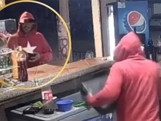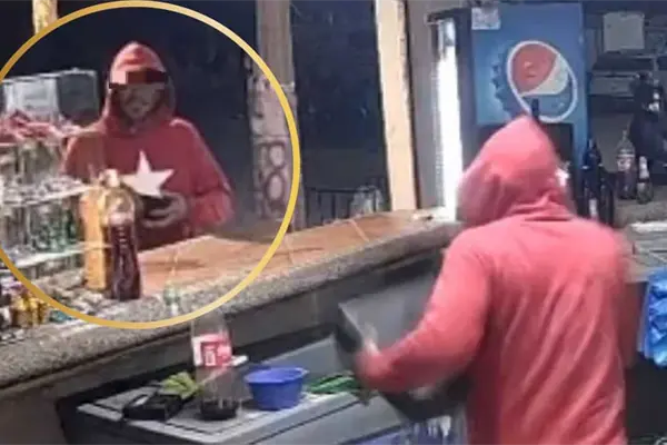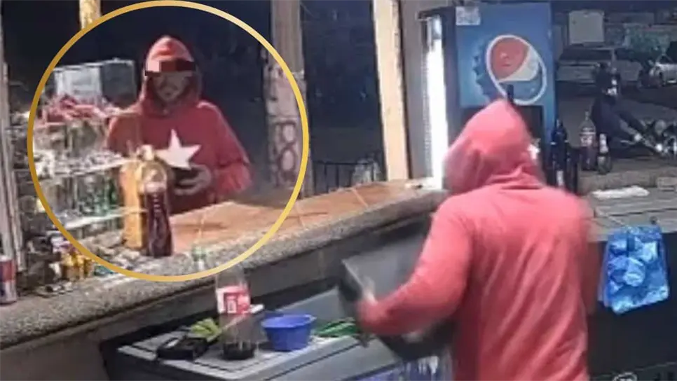 De acuerdo con las imágenes captadas por la cámara de seguridad del establecimiento, uno de los presuntos responsables viste una sudadera de color rojo con gorro y una estrella al frente, pantalón de mezclilla color azul y zapatos de color negro, aparentemente de trabajo.