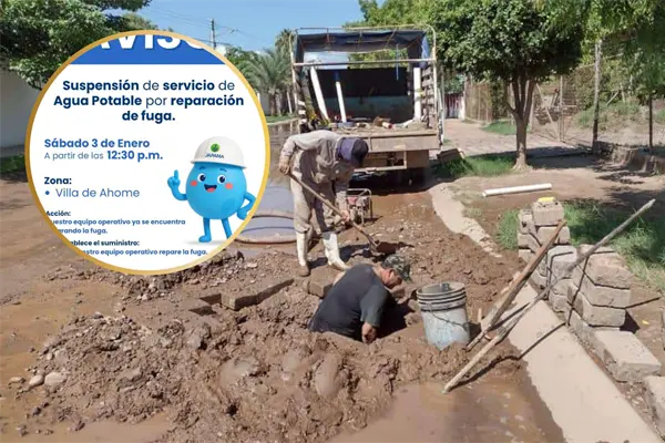 La Junta de Agua Potable y Alcantarillado del Municipio de Ahome (JAPAMA) informó sobre la suspensión temporal del servicio de agua potable en la Villa de Ahome, derivado de trabajos de reparación por una fuga detectada en la red hidráulica.