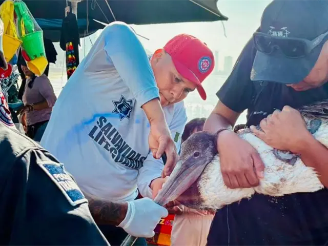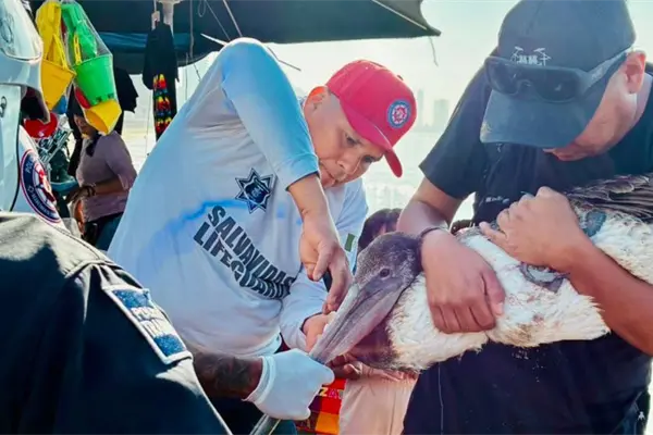 Elementos del Escuadrón de Salvamento Acuático, adscritos a la Secretaría de Seguridad Pública Municipal, auxiliaron a un ciudadano y un pelícano que resultaron afectados por un anzuelo de pesca.
