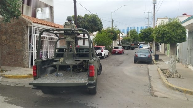 Elementos del Ejército mantienen un operativo por una de las calles del fraccionamiento canaco, a pocos metros de la Plaza Sendero en Culiacán.