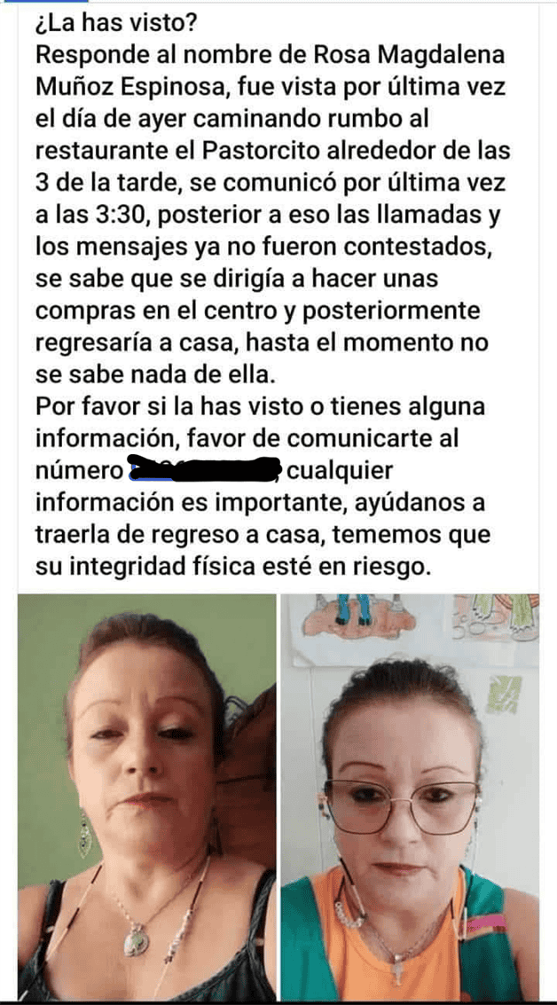 Sin embargo, luego de las 15:30 horas que envió un último mensaje a través de su teléfono celular, su familia perdió todo contacto con ella, ya que dejó de responder llamadas y mensajes, por lo que a través de redes sociales comenzaron a pedir ayuda para tratar de localizarla.
