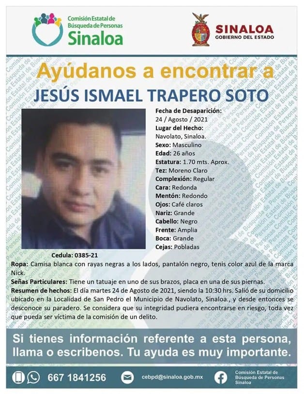 Jesús Ismael desapareció la mañana del pasado 24 de agosto del año 2021, cuando salió de su domicilio en la sindicatura de San Pedro, Navolato, y desde entonces no se sabía sobre su paradero.