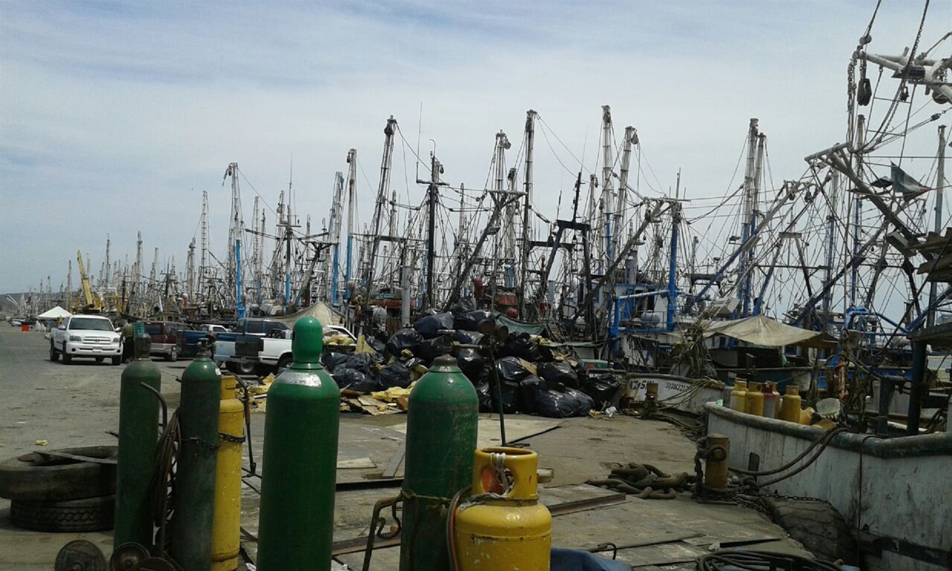 Mazatlán, Sin. - Cientos de barcos amarrados, la mayor flota pesquera de camarón de altamar del país paralizada, basura por todos lados, perros callejeros deambulando, algunos trabajadores haciendo reparaciones en embarcaciones, la industria empacadora semiparalizada, hay poca vida en el Parque Industrial V. Bonfil.