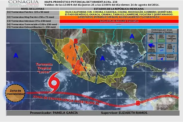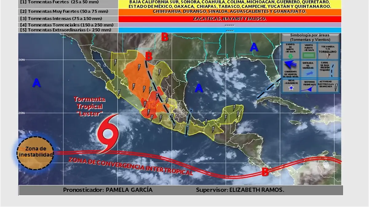 Ciudad de México.- El Servicio Meteorológico Nacional (SMN) prevé potencial de tormentas puntuales muy fuertes en Chihuahua, Durango y Sinaloa; así como tormentas puntuales fuertes en Sonora, Nayarit, Jalisco, Colima, Michoacán y Guerrero.