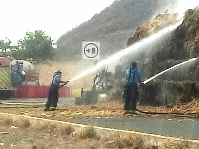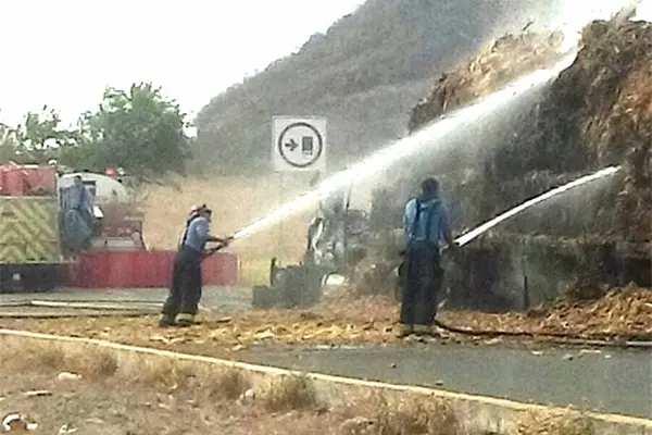 Bomberos acudieron al sitio y sofocaron las llamas, las cuales ya habían consumido la cabina del camión y dañaron gran parte de las pacas de pastura.