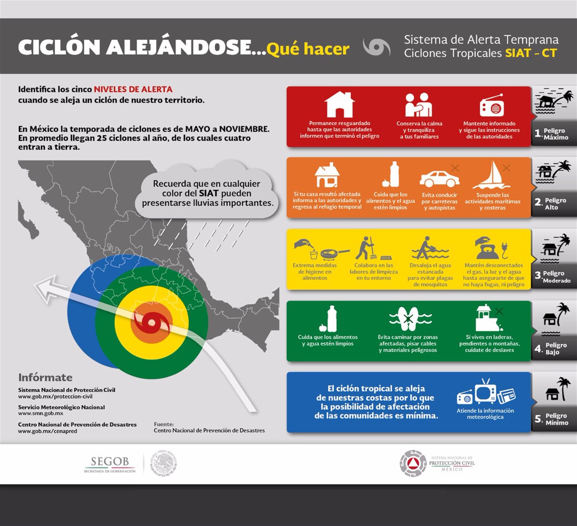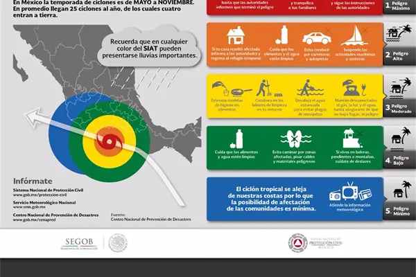 En una infografía, el Sistema Nacional de Protección Civil (SNPC) detalla los grados de prevención para la población en esta época de ciclones tropicales que se emiten a través de el Sistema de Alerta Temprana (SIAT) y que están clasificados en colores.