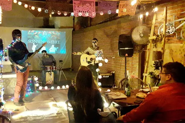 El lugar (un reconocido café literario) fue decorado con calaveritas, pan de muerto, un altar que fue confeccionado por los asistentes quienes llevaron dulces, caña, frutas y flores, así como el juego de luces y sombras para recordar los dos extremos de la vida misma.