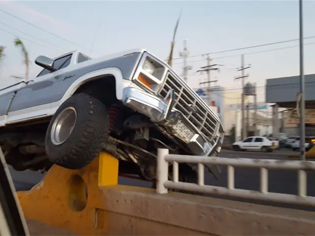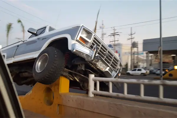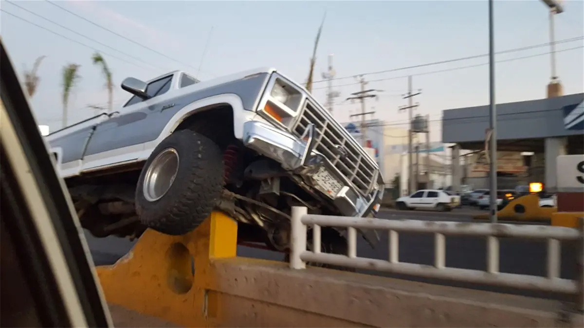 La unidad que se accidentó es una Ford F150 de modelo viejo, misma que quedó suspendida sobre el muro tras el impacto.