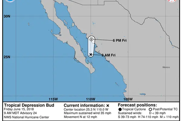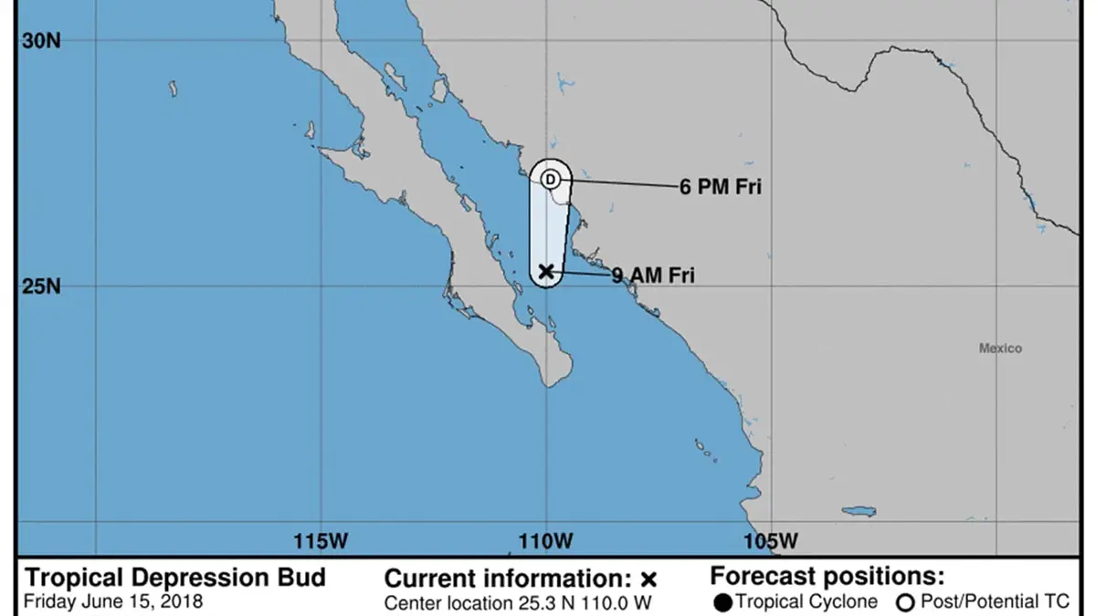 Bud es ahora una depresión tropical, ubicada a partir de las 9 a.m. mdt a unos 195 km (315 km) al sur-Sureste de Guaymas, México.